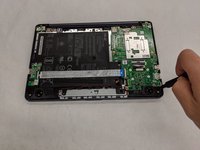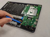 Using the iFixit opening tool again, carefully wedge the tool under a corner of the speaker connector on the motherboard that is connected by three wires (colored red, black, and white).