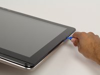 Wedge the plastic opening tool in between the screen and the bezel of the aluminum computer casing.