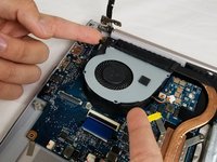 Lift the screen assembly hinge up and off of the motherboard fan.