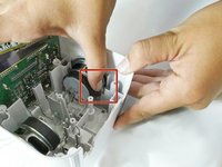 Using your thumb, applying constant pressure, pull back the plastic tab towards the speaker and away from the metal bracket.