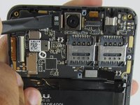 The rear facing camera is located in the center of the top motherboard. To access the rear facing camera the the back of the phone will need to be opened and the top cover for the motherboard will need to be removed. The connection is a press fit.