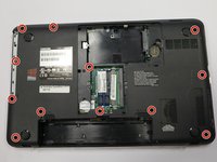 Unscrew the screws circled in red. This includes eleven 6mm screws, and one 5mm screw underneath where the optical drive was housed. All screws can be removed with a Phillips #0 screwdriver.