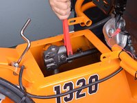 Use a 9/16 inch socket and wrench to remove the two bolts and accompanying nuts securing the engine guard to the tank lid, one on each side.