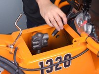 Pull the locking pin out and rotate it 90˚ to unlock the right wheel from the hub.