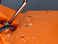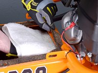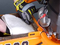 Use a 9/16 inch socket and wrench to remove the two bolts and accompanying nuts securing the engine guard to the tank lid, one on each side.