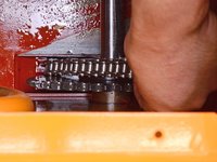 With the motor loose, rotate it 90˚ counterclockwise and push it as far left as it will go to give the drive chain some slack.