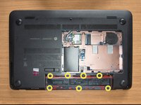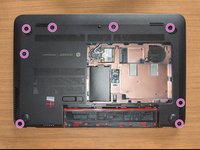 Using a PH#00 screwdriver remove then the eight Phillips PM2.5x5 screws that secure the base enclosure to the laptop. Group these screws together.