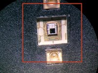 • The wire bonded Optical Blood Flow Sensor (under a magnifying glass) with the two LED