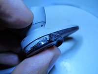 Carefully separate the glue from the tangs holding the button cover to the battery assembly and outter housing.