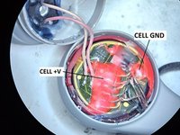 The negative terminal (cell ground) is a large soldered tab. The positive terminal is the second lead from the square IC chip.