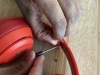 Carefully partially remove the headband cushion cover. Be careful not to rip the two headband eyelets just above the screws on each end of the headband.