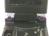 On the hinge of the camcorder remove the two 30 mm Phillips #0 screws.