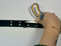 • Measure the pieces of leather so the resulting strap will wrap around with a width of 0.5 in and a 1 cm overlap.