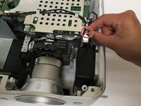 Using a Phillips #1 (PH1) screwdriver, loosen and remove the single 2.5 mm Phillips #1 screw that secures the lamp housing to the projector.