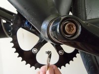 Place the spanner tool on the backside of the 6.5 mm chainring bolt. The spanner will be used to keep the bolts in place while unscrewing them on the opposite sides.