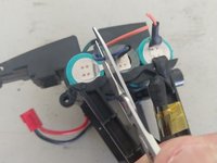 Slide the right side plastic carrier off of the batteries. 023 Note that two connectors are loose. So that you can determine the orientation of the batteries (where + or - goes) in the carrier, maintain the orientation while you slide the three batteries out of the left carrier. 024