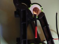 The orange wire needs to connect the the - of “b.Battery”, too. Push the thin blue and thin orange wire through the carrier. This is a good time to push the temperature sensor on the green wires into the carrier.