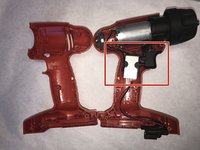 Lay the drill on its side, assuring that the screw holes are facing upwards.