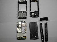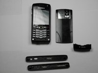 These are all the parts of the BlackBerry Pearl 8100 completely disassembled. From left to right, the parts are as follows: rear cover, front cover, motherboard, side covers, trackball, keypad, bottom cover, and frame.