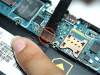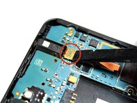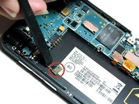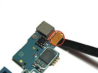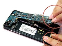 • Now that all of the ribbon cables have been disconnected, carefully lift the motherboard from its housing with your thumb and index finger. Start lifting the motherboard from the bottom and work your way to the top. Hold down the phone with your other hand so you have a better grip on the device. Once removed, turn the motherboard over.
