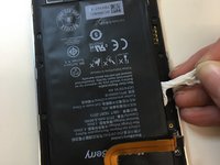 Gently pry up on the edges of the battery so that the adhesive will come out more easily. Take great care not to pierce the black "skin" on the battery.