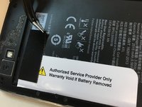 Carefully apply some low heat to the stickers covering the battery and gently peel them off. The white sticker is connected to adhesive under the battery.