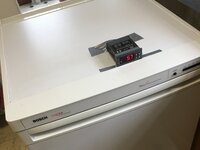 As a temporary measure, the wires and unit were duct taped in position. The unit could be hidden below the fridge's work-surface, once I am happy with the set up parameters. Alternatively, the stc1000 could be mounted on the side wall of the removable top section by cutting a rectangular opening, using the supplied mounting clips.