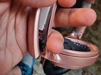 This grey rotating joint slips into place on both molded sides. The cable is threaded through the headband, this joint, and the earphone outside before you find it soldered onto the motherboard. Just a tip: that think rose-colored clip in the main picture fits onto the band Curved-Side-Down.