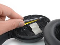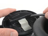 Grab the cushion of the left earcup and gently pull it to the center of the earcup to free it from the plastic clip holding it in place.