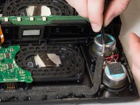 Using the T-10 star tip screwdriver, remove the two 13 mm screws located on the bottom of the speaker on each side of the battery pack.