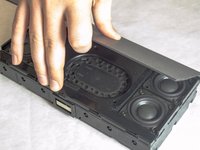 Remove the black electrical tape in order to reveal the screws attaching the side cover to the main body of the speaker. These screws are on the base of the device.