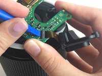 Using the blue plastic opening tool, pry up the small black clamp connecting the AUX/USB port to the lower circuit board.