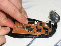 Lift the bottom board up to remove from its mounting posts. This will separate it completely from the bottom panel of the mouse.