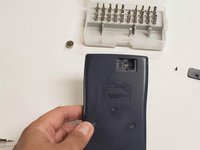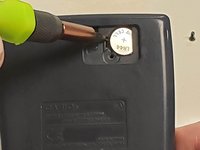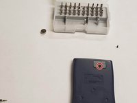 Remove the screw from the battery hatch on the top-right corner using a 1.5 mm slotted screwdriver.