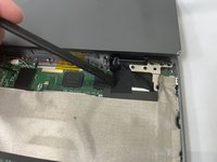 Use a Phillips #1 screwdriver to remove one 5.6 mm hinge screw on the lower-right side of the right hinge.