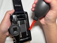 Squeeze the rocket blower to blow away loose foam or any foam particles that may have fallen into the camera. Hold it roughly an inch above the target areas.