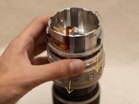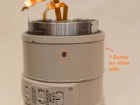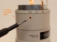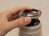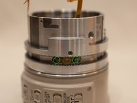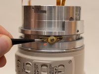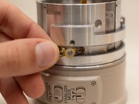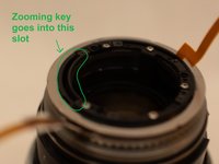 Place the zoom ring into place. The two screw holes should line up with the screw holes on the upper gear ring. The numbers on the zoom ring should be on the side of the lens with the focus window.