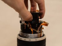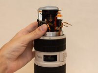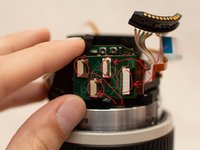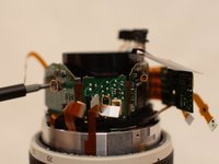 Carefully pull the IS lens assembly up and out of the lens. Be careful not to snag any of the ribbon cables.