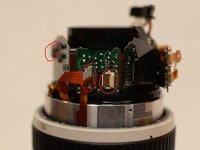 Remove the Phillips #00 screw holding the zoom ribbon cable in place.