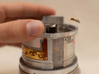 Lower the gear ring onto the intermediate barrel and then rotate the gear ring clockwise until the zoom brush is back over the ribbon cable.