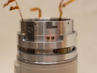 Line up the screw holes on the intermediate barrel and the front of the lens. Also make sure to line up the ribbon cables with the cut outs in bottom of the intermediate barrel.