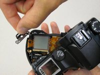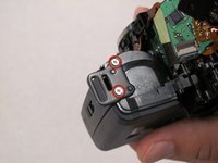 Remove two 5.9 mm silver screws on top of camera to detach left strap loop (opposite grip).