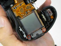 Remove one 8.5 mm silver screw (front) and one 5.45 mm silver screw (back) to remove strap loop near LCD screen.