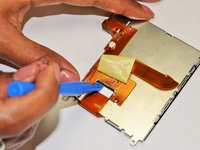 Use the tip of a spudger to disconnect the ZIF connector on the left side of the camera. The ribbon cable on this device was torn in the process of removing the back case, so there are no photos showing this step.