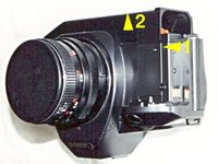 Removing the front cover completely is unnecessary, especially since it makes reassembly more difficult (the closing mechanism of the camera back likes to go to pieces and the position of the single parts of it is logically difficult to reconstruct).
