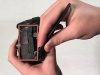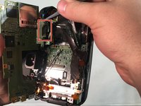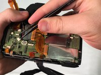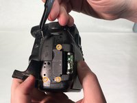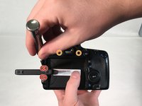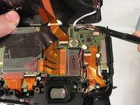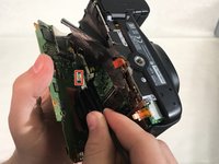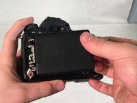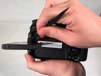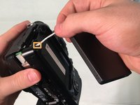 Remove two 4 mm Phillips #000 head screws that mount the LCD touchscreen to the hinge on the camera.