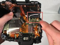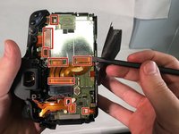 Carefully pry open backplate from camera to expose LCD connector (white wire). LCD connector is attached with a metal bar to the motherboard.
