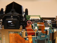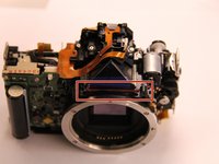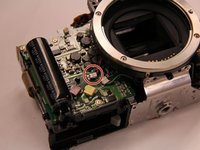 Remove the viewfinder assembly from the camera. The screws that hold the eyepiece in place are accessible. Remove these three JIS #000 screws from the rear face of the eyepiece. Two screws are located at the bottom and one screw is located on top.