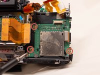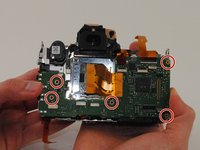 Remove the four silver 4mm JIS #000 screws connecting the LCD screen to the back of the camera.
