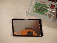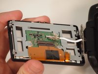 There are several components inside the casing. A board, a power cable, the screen and a ribbon cable. First, using tweezers lift the metallic clamp connecting the ribbon to the board.
